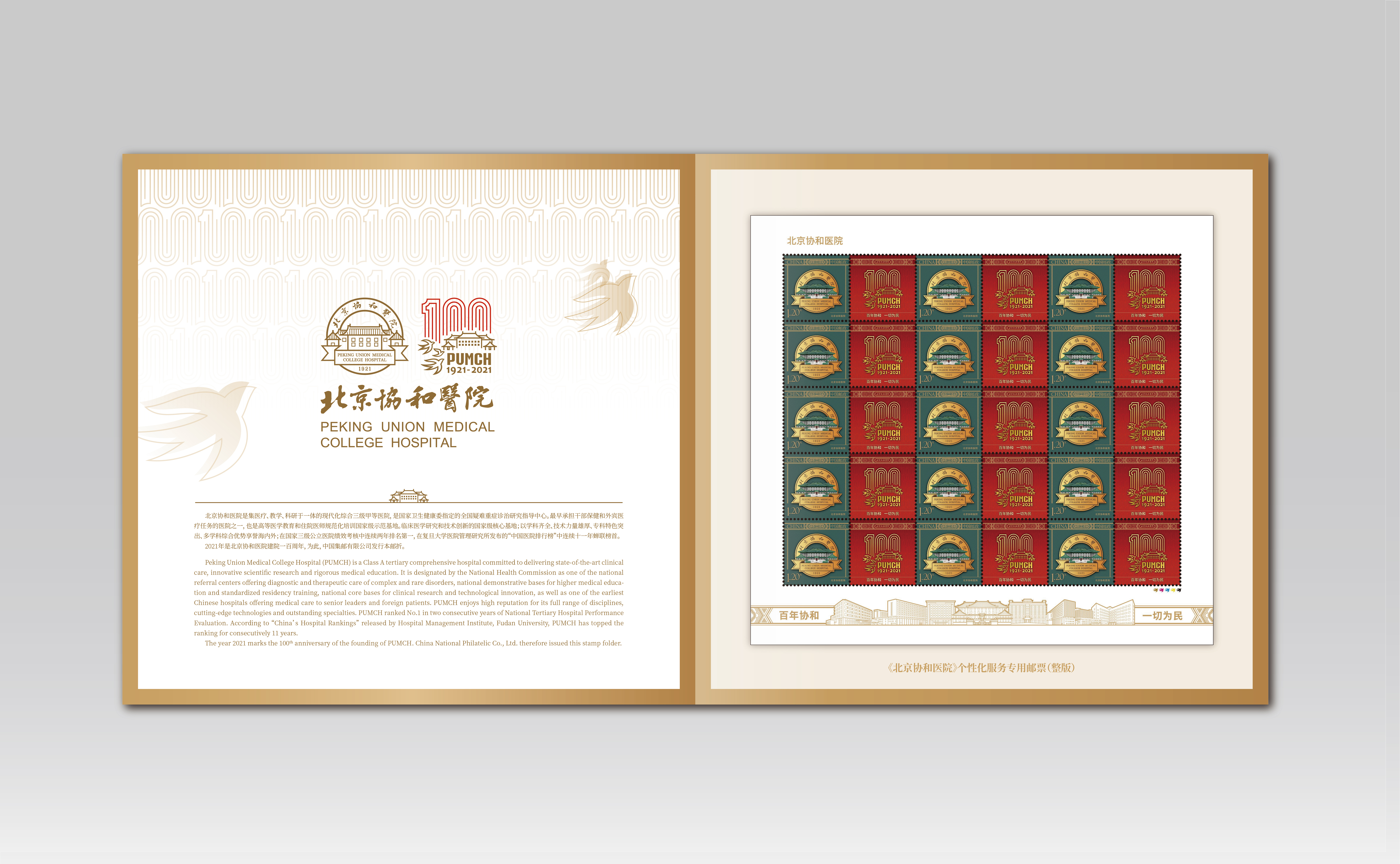 副票创新性地使用了大面积烫金工艺,用以展现北京协和医院百年院庆标志,极大地提升了邮票图形的层次、质感与光感,这也是中国邮政首次在个性化邮票中采用烫印工艺,成为本次票面设计的点睛之笔。邮票版边的边饰由北京协和医院百年历史进程中具有代表性的建筑与“百年协和,一切为民”的百年院庆主题共同组成。主票还将协和医院古建筑的斗拱图案与邮票构图巧妙结合,整个画面恢弘大气、主题突出、特色鲜明、构思精巧,历史厚重感与时代感相互交融。