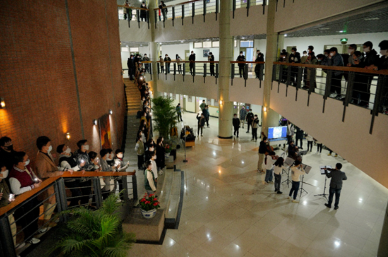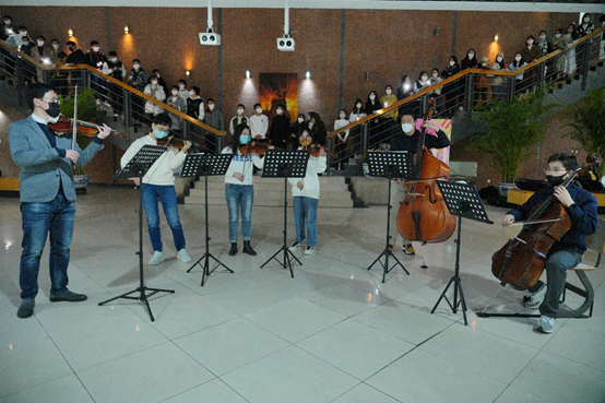 3月21日,首场“课间音乐会”亮相第六教学楼。学生艺术团交响乐队演奏了由同学自主改编的冬奥口号推广曲《一起向未来》交响乐版;学生艺术团合唱队、键盘队合作演绎《雪花》《这世界那么多人》。现场200余名师生驻足观看,共同欣赏温暖的歌声与动人的乐曲。