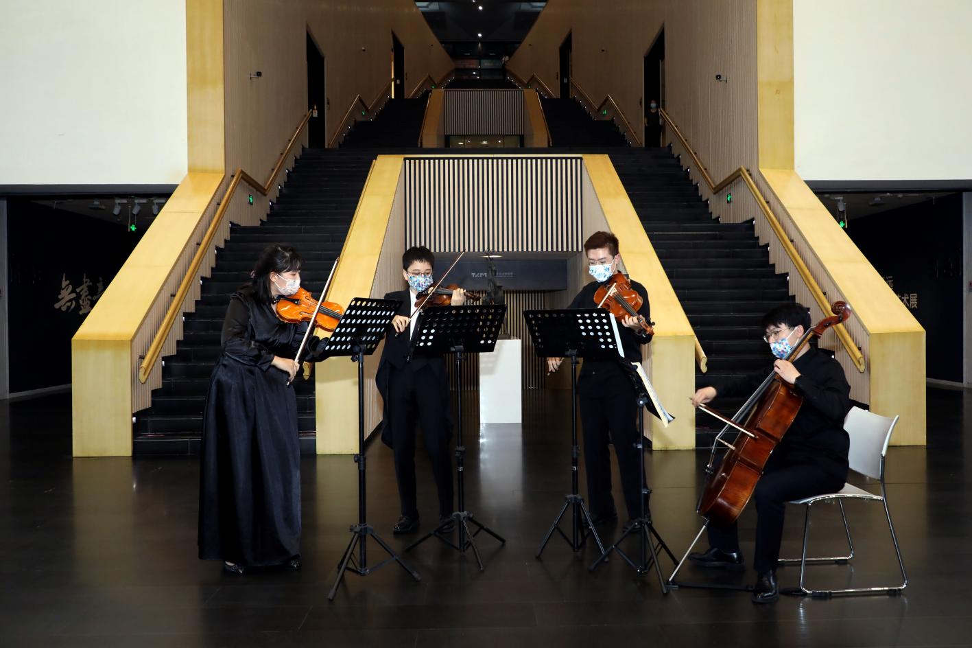 此后的晚场展览中,学生艺术团军乐队、交响乐队、合唱队、京剧队队员分别前往宇宙厅、温度厅、冯远厅,为观众带来一场场别样的音乐体验。交响乐队队员演奏的巴赫《大提琴无伴奏第一组曲》庄重典雅,莫扎特《小提琴中提琴二重奏》精巧灵动,军乐队带来的双簧管独奏《加布里埃尔的双簧管》深邃动人,长笛二重奏《千与千寻》细腻优雅。键盘队带来的手风琴独奏《安南探戈Anantango》别有风情,京剧队表演的《霸王别姬》刚柔并济,合唱队演唱的《但愿人长久》情意浓浓……时空交叠,旋律共振,现场观众伴着美妙的乐声,徜徉于艺术的海洋。