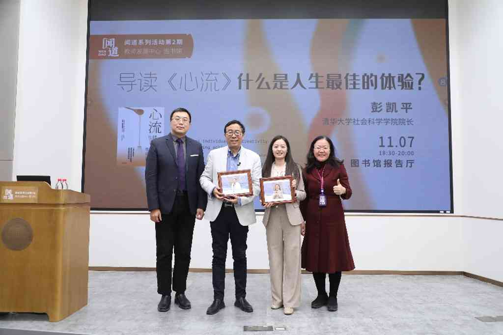 党委教师工作部副部长、教师发展中心副主任郭庆来作总结,并与图书馆副馆长张秋共同为嘉宾和主持人赠送活动纪念品。郭庆来表示,彭凯平教授的导读内容充实、发人深省,聆听分享的过程本身即是对“福流”的体验与传递。彭凯平教授充分结合生活实际,为大家提供了很多具有实操性的方法技巧,帮助大家疏解压力、以期获得人生的最佳体验。未来,“闻道”系列活动将持续邀请具有思想性和影响力的嘉宾作经典导读,并坚持发扬特色,邀请熟悉嘉宾的青年教师主持活动,以挖掘和培养一批有理想、有志趣的青年教师,成长为读书活动的核心力量。