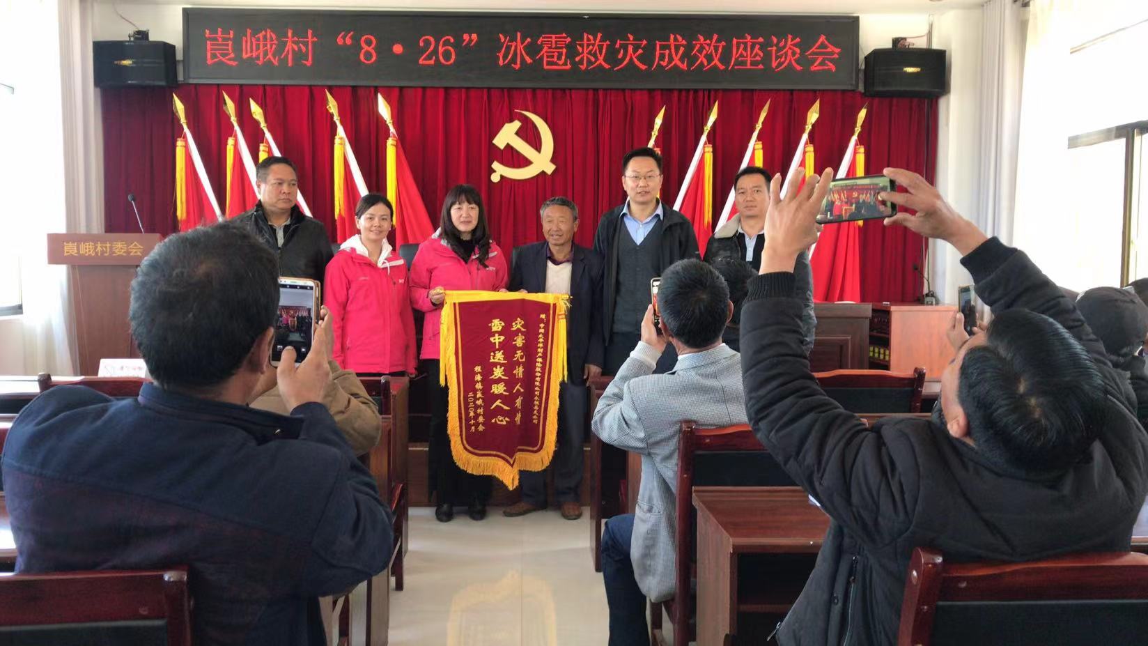 张开迪(右二)在崀峨村委会向村民介绍救灾成效