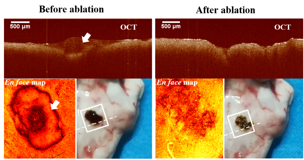 OCT引导激光消融前后肿瘤区域(白色箭头指向肿瘤)