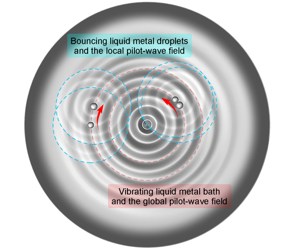 “在之前报导过的硅油体系中,液滴的运动是由液滴自身产生的单一导航波场来导航的。而在我们的体系中,液滴的弹跳和液池边界的振动会分别产生一个局部导航波和一个全局导航波,这是由于液态金属的特殊流体性质决定的。”这项研究的第一作者汤剑波博士解释道,“正因如此,我们能够实现更丰富更复杂的液滴导航模式”。
