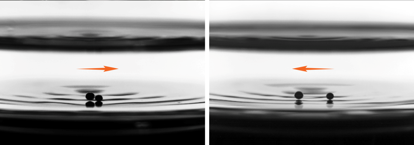 这些引人入胜的现象的背后是液滴与液池表面的导航波场之间的一系列微妙相互作用。从侧面观察会发现,这些在液面水平方向上旋转追逐的液滴同时在竖直方向上不停的弹跳。研究发现,如果两个液滴的大小不相同,他们弹跳的节奏就会不同步。较小的液滴在弹跳过程中总是先于较大的液滴抵达液面。而正是由于这一竖直方向弹跳的不同步引起了液滴水平方向的运动(图4)。