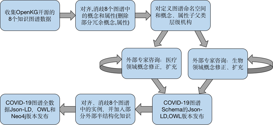 疫情暴发初期,OpenKG(openkg.cn)公布了新冠知识专题,其中包括了8个独立的人工或半人工整理的知识图谱,涉及健康、防控、流行病、百科、人物、医疗、物资、事件、科研等方面。然而这些知识图谱规模不一,质量不一,且存在重叠和不一致等情况。