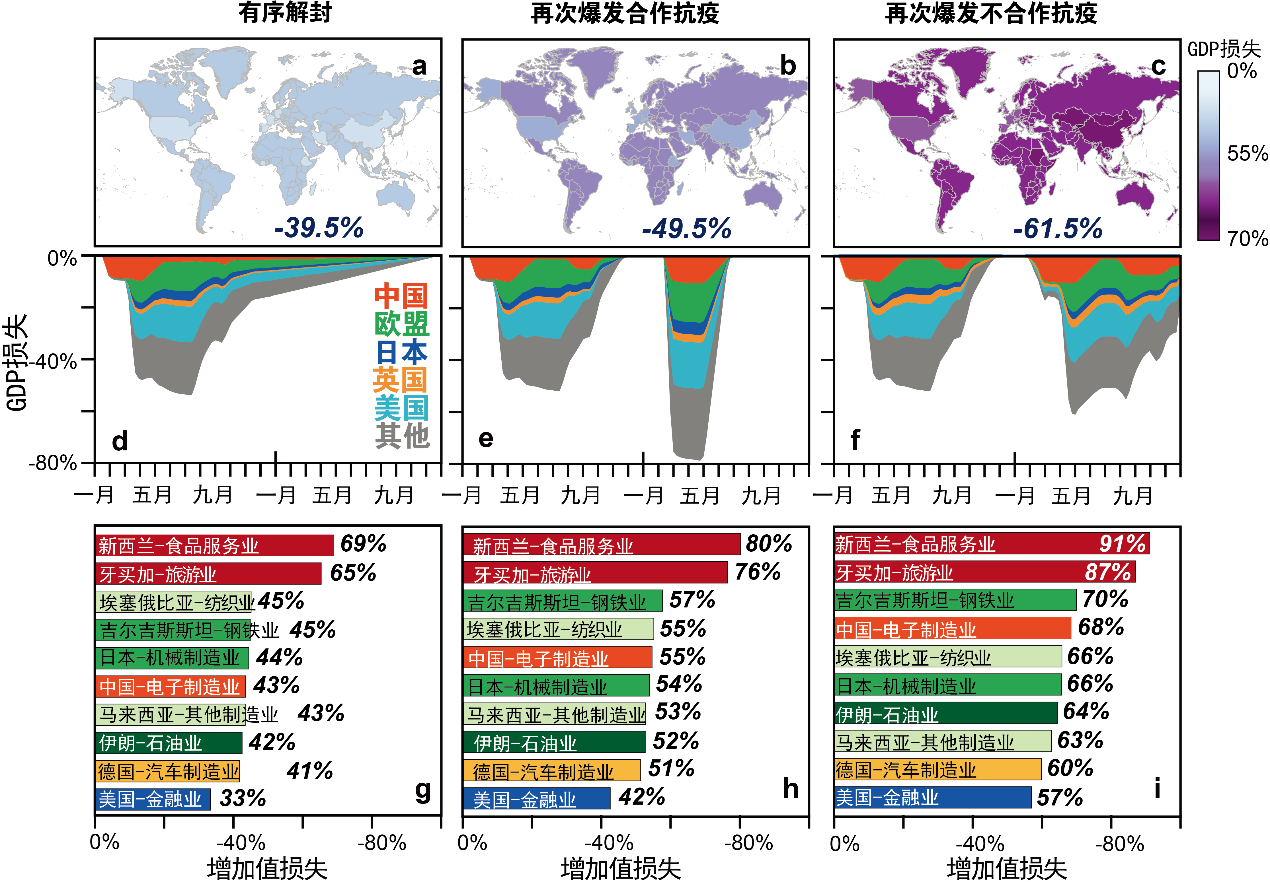 研究结果显示,首先,严格的防控措施不是导致经济损失的最主要原因,若各国通过严格有效的控制措施以缩短疫情持续时间,将减轻全球经济损失。其次,产业链传导效应放大了疫情对部分国家的经济影响,没有直接受到疫情影响的国家也可能遭受巨大经济损失,尤其是中低收入国家更易受到间接的经济影响,如以能源出口为主的中亚国家和以旅游为主的加勒比地区。与此同时,全球范围内的关键产业链受疫情影响严重,鉴于产业链联系的紧密性,产业链条中断和终端消费需求下降导致全球性的行业衰退,如中国电子制造业和德国汽车制造业的产量预计分别下降13%-53%和2%-49%;且在疫情得到初步控制后,全球经济重启的过程要注意循序渐进,研究认为若快速“解封”导致疫情再次失控,全球经济将遭受更为惨重的损失。