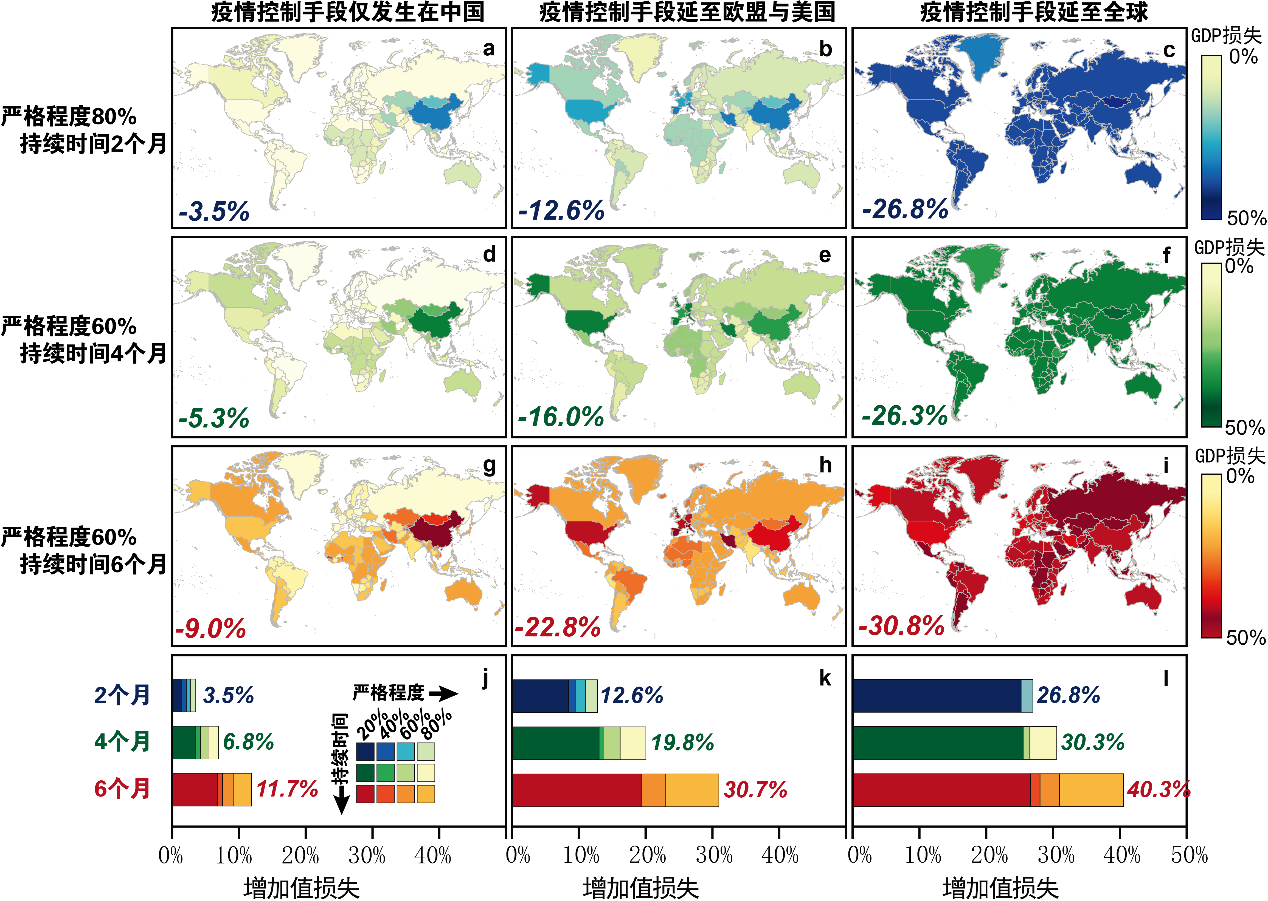 图1 不同防控措施情景下新冠肺炎疫情对全球经济的影响(增加值损失)