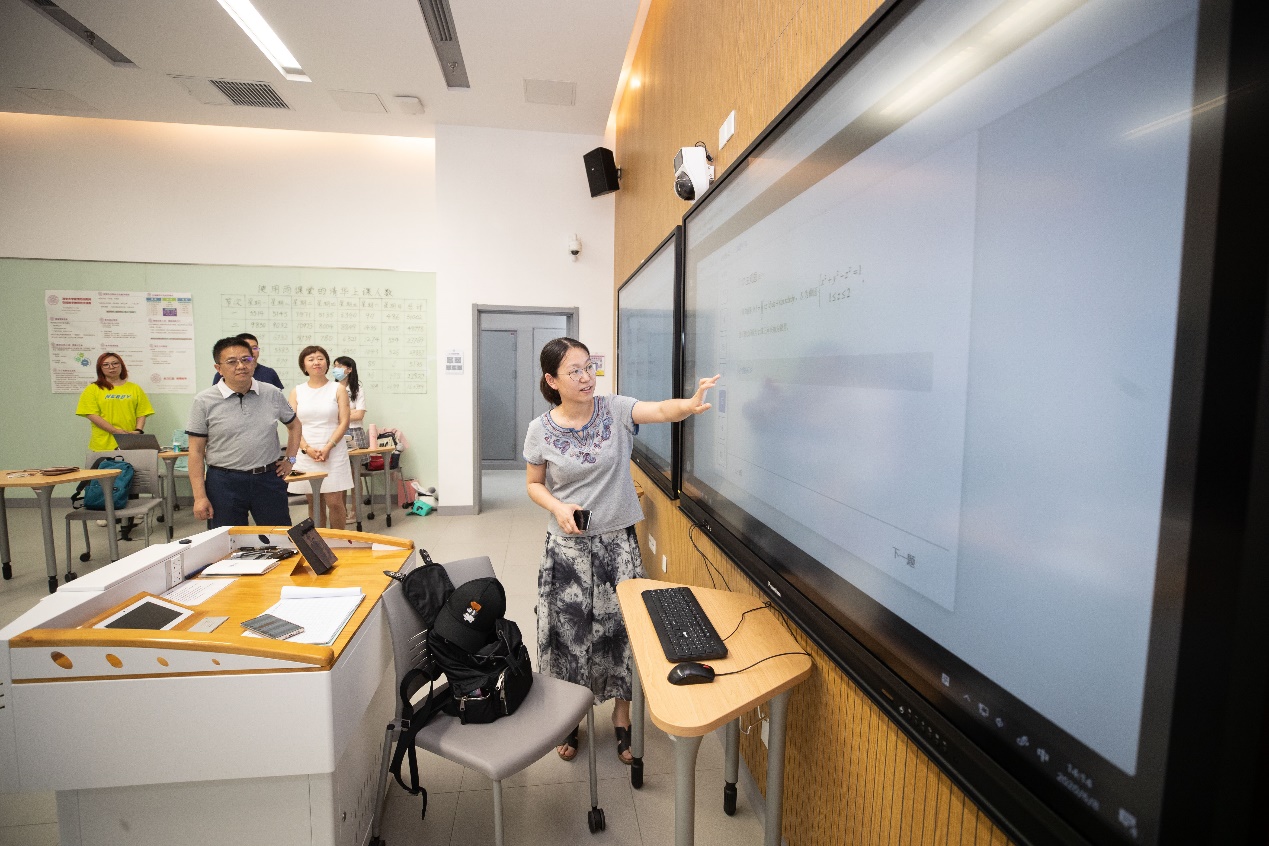 在教学指挥中心,环绕教室的多块电子屏实时显示着在线考试的情况。手指轻滑屏幕,就能查看全校考试安排和学生在线考试情况,轻轻一点就可以进入到“在线考场”了解同学们此刻的考试状态。下午两点半,一场在线考试正在云端进行,电子屏上显示着学生考试的画面,神情十分认真。陈旭在每一块电子屏前认真听取介绍,并点击进“考场”了解同学们的考试情况。