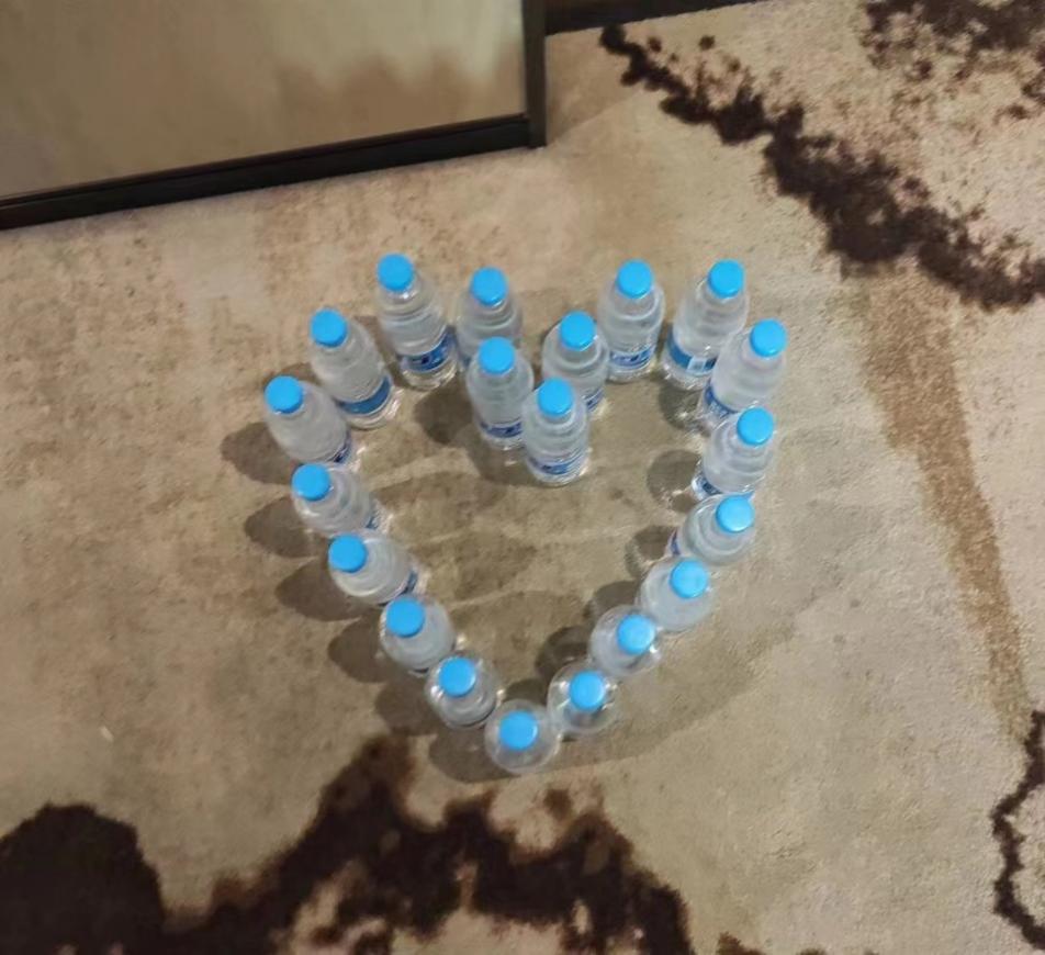 隔离不隔爱,驿站带给了同学们温暖,同学们离开时也留给了工作人员满满的感动。手写感谢卡、微信留言、手作小礼物……“还有用矿泉水瓶拼成的爱心,应该是同学们离开前做好的”。