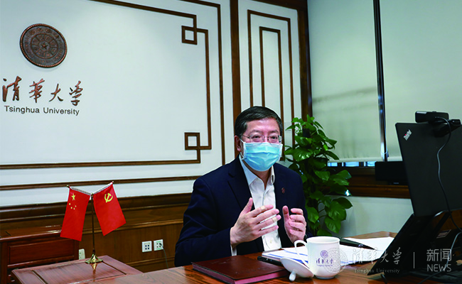 邱勇向同学们介绍了学校近期情况,特别提到2月3日5万余名师生“同上一堂课”、2月17日线上全面如期开课,充分体现了清华人的自强精神和责任担当。“我们正在一起经历学校发展过程中重要的历史时刻。”邱勇说,“本学期全校2000多位教师共开设3900多门次在线课程,大规模实时互动的在线课堂教学突破了线上教学和线下教学的界限,也拓展了大学校园的界限,清华师生在哪里,教书育人工作就延伸到哪里。疫情防控期间开展的大规模在线教学,极大地促进了清华混合式教学的发展,进一步强化了清华教师教书育人的职责,进一步彰显了清华人的家国情怀和自强精神。”邱勇表示,学校在湖北地区成立了六个学生临时党支部,组织了清华人“宅家充电”计划、“云上学堂”、“一小时锻炼计划”、“水木青年读书计划”、“THU假期提升计划”等丰富多彩的活动。