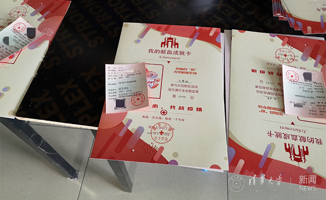 志愿者为献血师生准备献血成就卡
