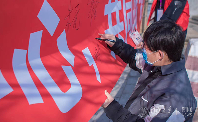 献血师生在横幅上签字祝福
