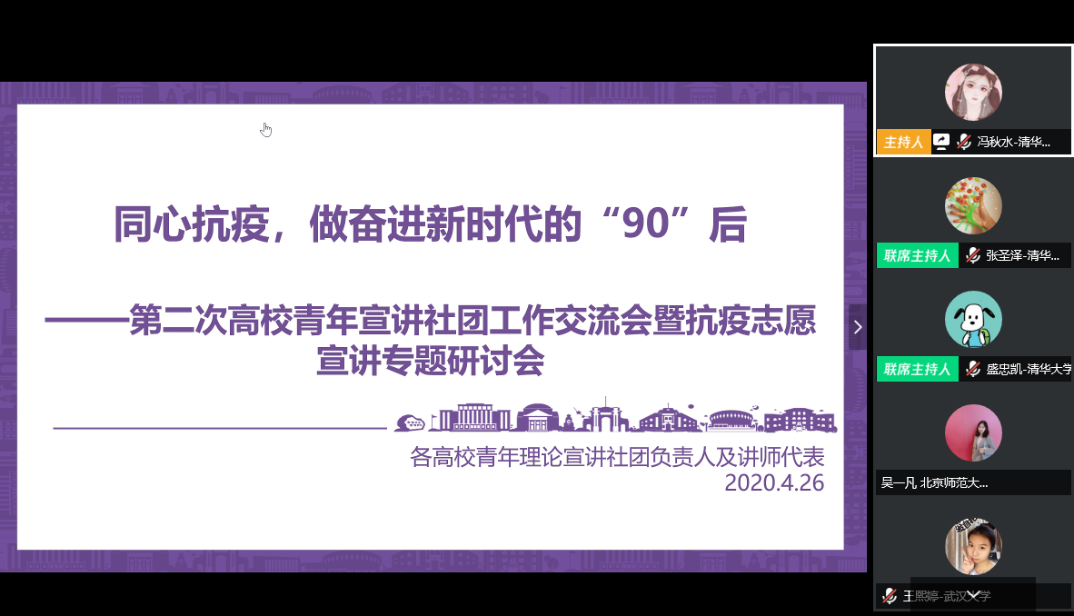 本次高校青年宣讲社团工作交流会暨抗疫志愿宣讲专题研讨会以“同心抗疫,做奋进新时代的‘90’后”为主题,重点围绕总书记在疫情期间的视察讲话、回信的重要精神进行学习,开展交流分享,形成宣讲合力,为迎接五四青年节的系列交流活动、促进高校间常态化交流学习打下了良好基础。