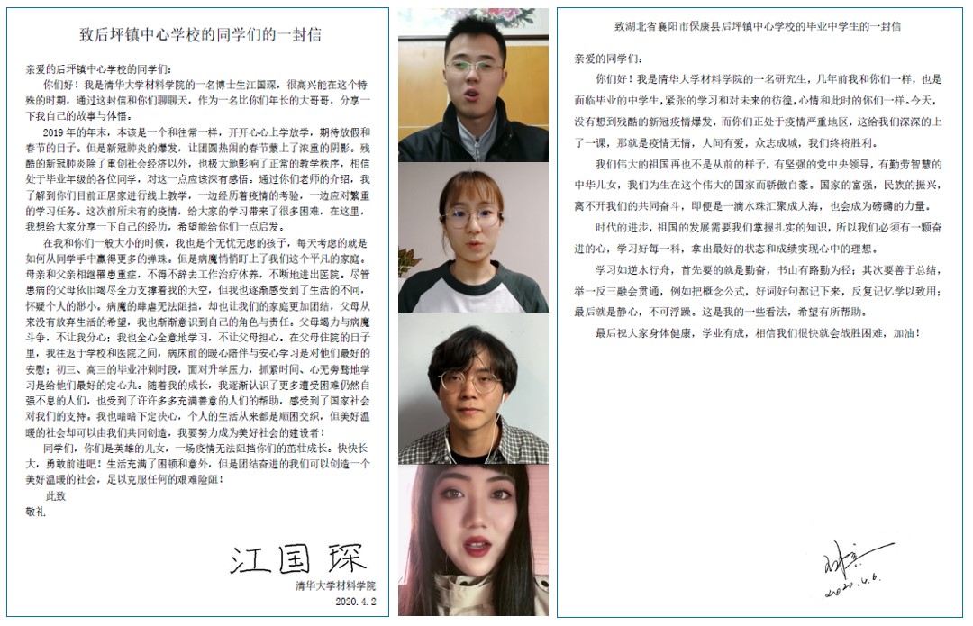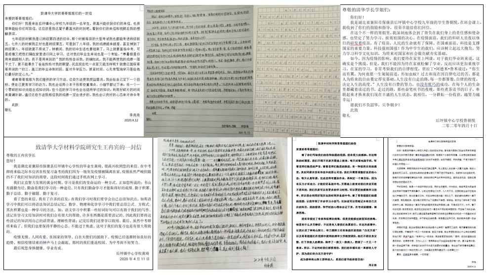 材料学院研团总支举办了“荆楚情,清华心”线上志愿活动,志愿者们积极投身公益,以行动奉献爱心,通过写信、录视频的方式,为湖北省襄阳市保康县后坪镇(贫困镇)中心学校的毕业生们送去关爱、鼓励与祝福。