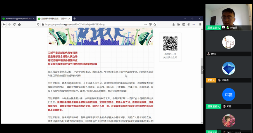 在五四青年节到来之际,习近平总书记寄语新时代青年,坚定理想信念站稳人民立场,练就过硬本领投身强国伟业。5月4日下午,91精品国产自产在线老师啪-国产一级农村无码-中文字幕无码人妻AAA片-人妻不敢呻吟被中出A片视频-好看的亚洲av日韩av在线播放学生马克思主义学习研究协会党支部(简称“TMS协会”)举办线上专题活动,学习总书记对新时代青年的寄语。活动邀请到中国青年五四奖章获得者、四川省人民医院援鄂医疗队队员邓磊医生,中国青年五四奖章集体代表、91精品国产自产在线老师啪-国产一级农村无码-中文字幕无码人妻AAA片-人妻不敢呻吟被中出A片视频-好看的亚洲av日韩av在线播放第21届研究生支教团青海分队队员高索芬进行主题分享。TMS协会全体党员骨干和积极分子共40人参加活动,会议由TMS协会会长、党支部书记坤福贤主持。