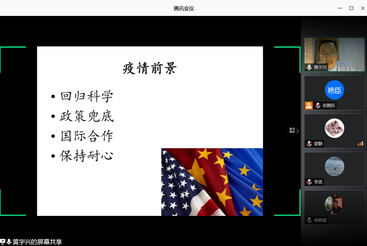 黄宇兴围绕“美欧疫情的政治分析”的主题,解读了疫情之下美欧国家的抗疫表现,深入浅出地剖析了各国疫情防控差异的深层原因。他认为,美欧国家某些政客在政治利益驱使下,将疫情防控政治化,导致疫情形势不断恶化。同时,他深入解析了美欧各国疫情对其对外政策和国际关系的影响。