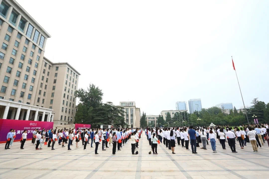 清晨七时整,升国旗仪式正式开始。国旗仪仗队的同学们英姿飒爽,步伐矫健,护送着鲜艳的五星红旗正步走向旗杆。全体师生面向国旗肃立致礼。军乐队奏响激昂的《义勇军进行曲》,鲜艳的五星红旗冉冉升起,迎风飘扬。校党委书记陈旭在国旗下讲话中勉励大家大力弘扬伟大抗疫精神,毫不放松抓好常态化疫情防控,全面推进学校改革发展事业,全身心投入到新学年的学习工作中,不忘立德树人初心,牢记为党育人为国育才使命,以攻坚克难、争创一流的实际行动向国旗敬礼、为国旗增辉。师生与医务工作者代表带来配乐诗朗诵《清晨,国旗从这里升起》。最后,全体师生挥舞着手中鲜艳的国旗,共同唱响《歌唱祖国》。