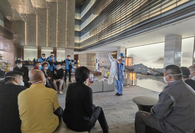 除防疫任务外,为隔离人员提供健康保障是首要工作。隔离人员抵达时,队员们做好统计登记,排查出67位患有基础疾病的患者。为更好更及时地处理突发情况,医疗队安排专人值班开通了24小时医疗热线,专门携带心电图机、除颤仪、氧气瓶等设备和对症处理的应急药品进入隔离点,在保证发热患者可被及时转运至定点医院排查的基础上,还可以确保一旦发生其他意外,能够为隔离人员迅速实施急救。医疗队与医院大本营保持着积极沟通,实现多维度保障。“隔离期间,一位妈妈紧急联系我们,说8个月大孩子突发呕吐让她不知所措,我们迅速联系了院内儿科进行会诊,在医师的专业指导与耐心安抚下,这位新手妈妈逐渐掌握了新生儿喂养的技巧,孩子的呕吐症状也逐渐消失。”医疗组组长汤睿说,“还有隔离人员突发关节肿痛,我们立刻联系院内骨科医师,诊断为痛风后及时给药治疗,患者的疼痛很快得到了缓解。”