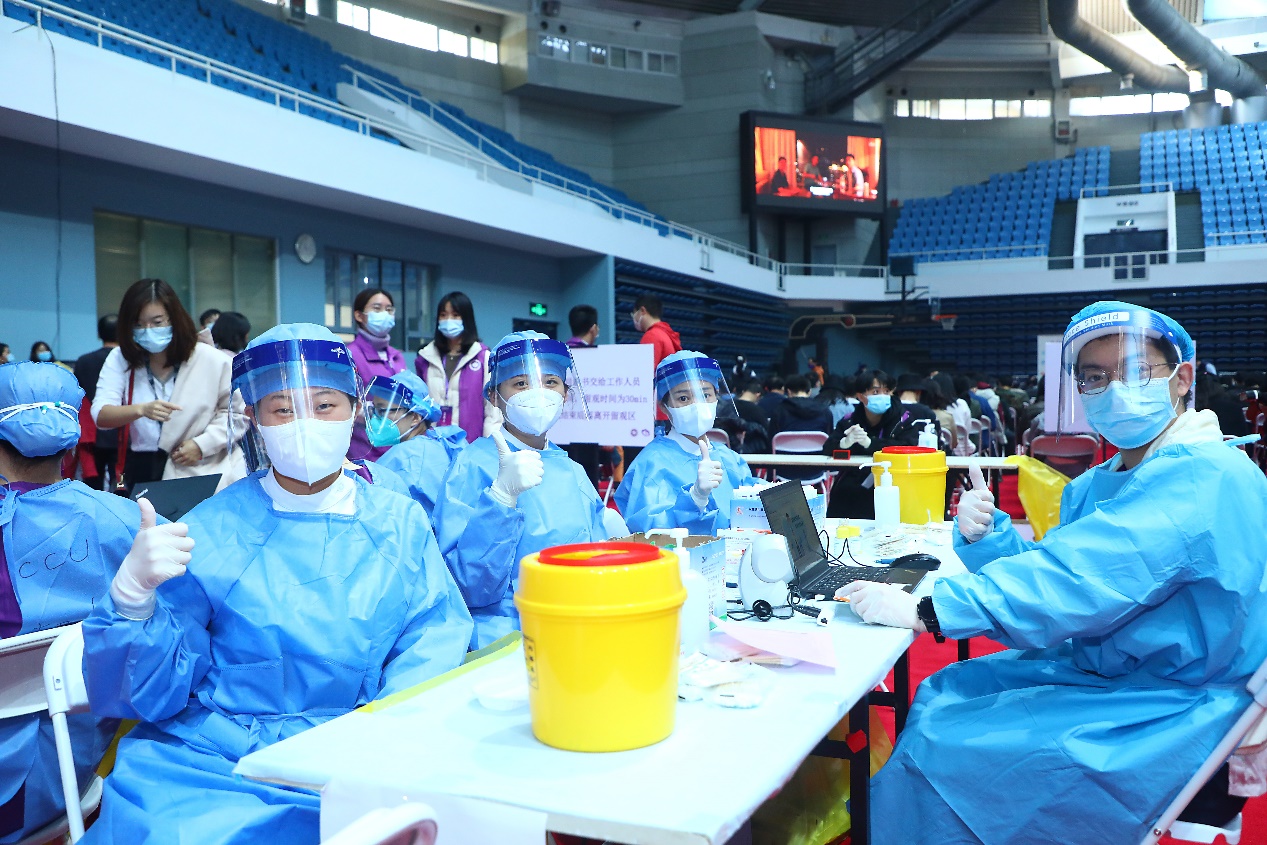 10月31日上午,过勇一行来到综合体育馆看望医务人员和正在接种加强疫苗的师生,向医务人员的辛勤付出和同学们对学校疫苗接种工作安排的支持、理解表示感谢,并期待学校疫情防控工作取得最终胜利。