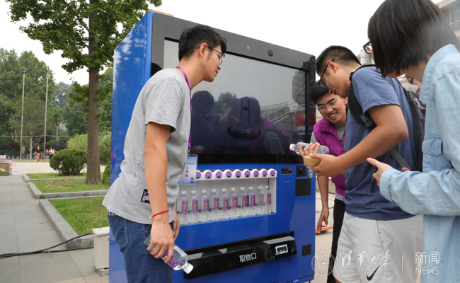 综合体育馆外的一台AI机前吸引新生们排起了长队。AI机里都是校研会为新生们专门定制的矿泉水,同学们可以与AI互动,通过“刷脸”付费,就能得到“独家定制”的矿泉水。9款矿泉水的瓶身上分别刻有“人生赢家”“健身狂魔”“小鲜肉”“研究僧”“灵魂伴侣”“发际线”“双肩挑两不误”“特奖人生”等字样,体现了鲜明的清华特色和丰富的校园文化。