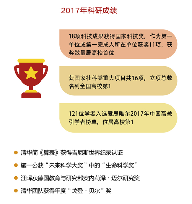中国已经从高速度增长进入了高质量发展的新时代,清华的发展也到了进一步强调质量提升、内涵式发展的新阶段。学校坚持不忘育人初心,始终牢记建设世界一流大学使命,扎实推进各项工作,以办学质量是否得到提升作为检验一切工作的标准。过去一年,学校坚持正确方向、坚持立德树人、坚持服务国家、坚持改革创新,扎实推进综合改革,加快全球战略实施,持续提升一流大学建设水平,各项事业都呈现出新的面貌。107周年校庆之际,《新清华》再次独家策划推出“图说清华又一年”校庆特稿,以图文并茂的方式总览清华2017年重要工作进展和发展建设成绩,展望清华更美的芳华!