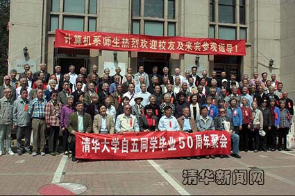 清华新闻网4月26日电(通讯员 尤晓慧)4月25日上午,1965届自控系98位校友连同家属百余人,在主楼东阶梯教室举行了毕业50周年聚会,同时庆祝母校104岁华诞。校友们在计算机系门口合影留念的时候,校党委书记陈旭特地赶来参加。
