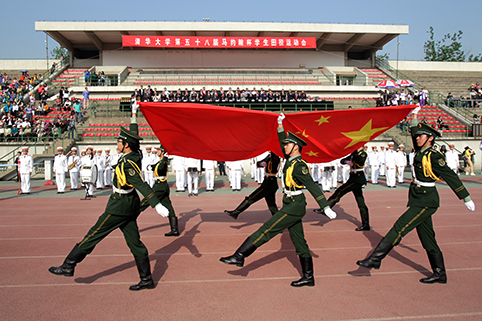 早上不到7点30分,参加运动会开幕式的同学们已经整装待发。上午8点,随着校军乐队激昂的乐声,国旗班成员、校旗方阵及各院系运动员方阵依次入场,主席台上全体领导起立,为同学们鼓掌加油。整齐的着装、铿锵有力的口号,奋发向上的精神,各方阵依次入场,展示了清华学子朝气蓬勃、积极向上的风采。环境学院身着统一的运动套装,活泼幽默的吉祥物引得观众们会心微笑;土木建管系的同学们高喊“土木体育,再创辉煌”的有力口号,饱含激情地喊出了新时期土木人的自信与勇气。水利系以整齐的步伐展示风采,也展示着本次参赛的拼搏梦;连续四年夺得马杯甲组冠军的自动化系打出横幅“自动化必将用自己的拼搏震撼东操的大地”,他们的口号是“马杯精神 代代相承 自动化系 永远力争”;而走过主席台的校友方阵更是搏得了看台上的阵阵欢呼和热烈掌声,他们从祖国各地、甚至从大洋彼岸赶来,只为在母校生日时欢聚,方阵中的许多校友已经为祖国健康工作了50年,他们将在运动会上再展风采,传承清华体育精神,重温当年美好时光。