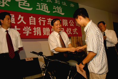 【新闻中心讯 记者 周襄楠 摄影 郭海军】8月18日上午,在迎新现场的绿色通道,2004级化学系新生聂晓琳从河北省强久自行车公司负责人手里接过簇新的银灰色的自行车,说:“社会上的爱心我们将永远铭记。”