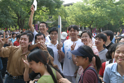 【新闻中心讯 记者 周襄楠 摄影 郭海军】“我摸到了火炬!”医学院的本科同学小李异常高兴得对我说,尽管由于酷暑他脸上的汗水模糊了他画在脸上的国旗。由于他们班同学在二校门内的位置正好是火炬交接的位置,所以他们班很多同学得以幸运地在火炬交接的时候从撤下的火炬手手里摸到了火炬。