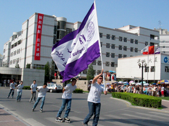 快讯:我校6名轮滑手手持校旗到东门外迎接火炬。(摄影 薛建团)