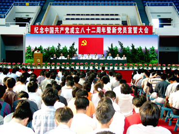 随后,举行了庄严的新党员入党宣誓仪式。与往年不同的是,今年,受到表彰的共产党员、全校中层以上党员干部和新入党的党员一道宣誓,在鲜红的党旗下,新老党员庄严地举起自己的右手,向党宣读自己的誓言。