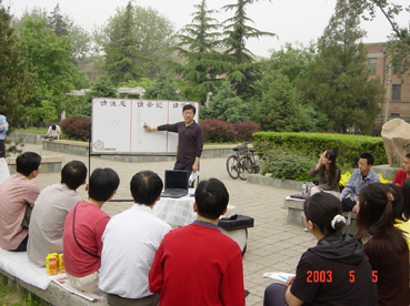 蓝天之下,阳光之中,呼吸着新鲜的空气,同学们思维更加开阔,学术思辨更加活跃,现场的学术气氛既庄重又轻松,不同年级、不同专业和研究方向的同学自由交流学术思想,互相启发,不仅促进了学术的交流,也促进了大家在“非典”这一特殊时期的感情交流,增强了战胜“非典”的信心。