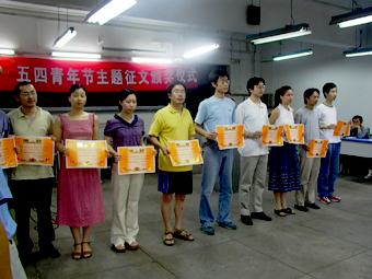 颁奖会在轻松愉快的气氛中开始,校党委副书记张再兴,以及校党委宣传部、研究生院的有关领导出席仪式并为获奖同学颁奖。三位获奖者还当场朗诵了自己的获奖作品。计算机系的谢晓楠同学在她的《就是那一道栏杆——致东门》中以幽默的笔触刻画了非常时期的所见所感;机械系的李英同学则在他的《SARS世中之不亦快哉一十三则》中表现了面对现实的勇敢乐观;热能系王庆同学的《从SARS看中华民族精神和共产党员责任》让人感受到强烈的民族责任感和催人奋进的力量。