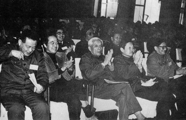 1980年1月在广州粒子物理讨论会。前排左起:彭桓武、李政道、周培源、杨振宁、朱洪元。