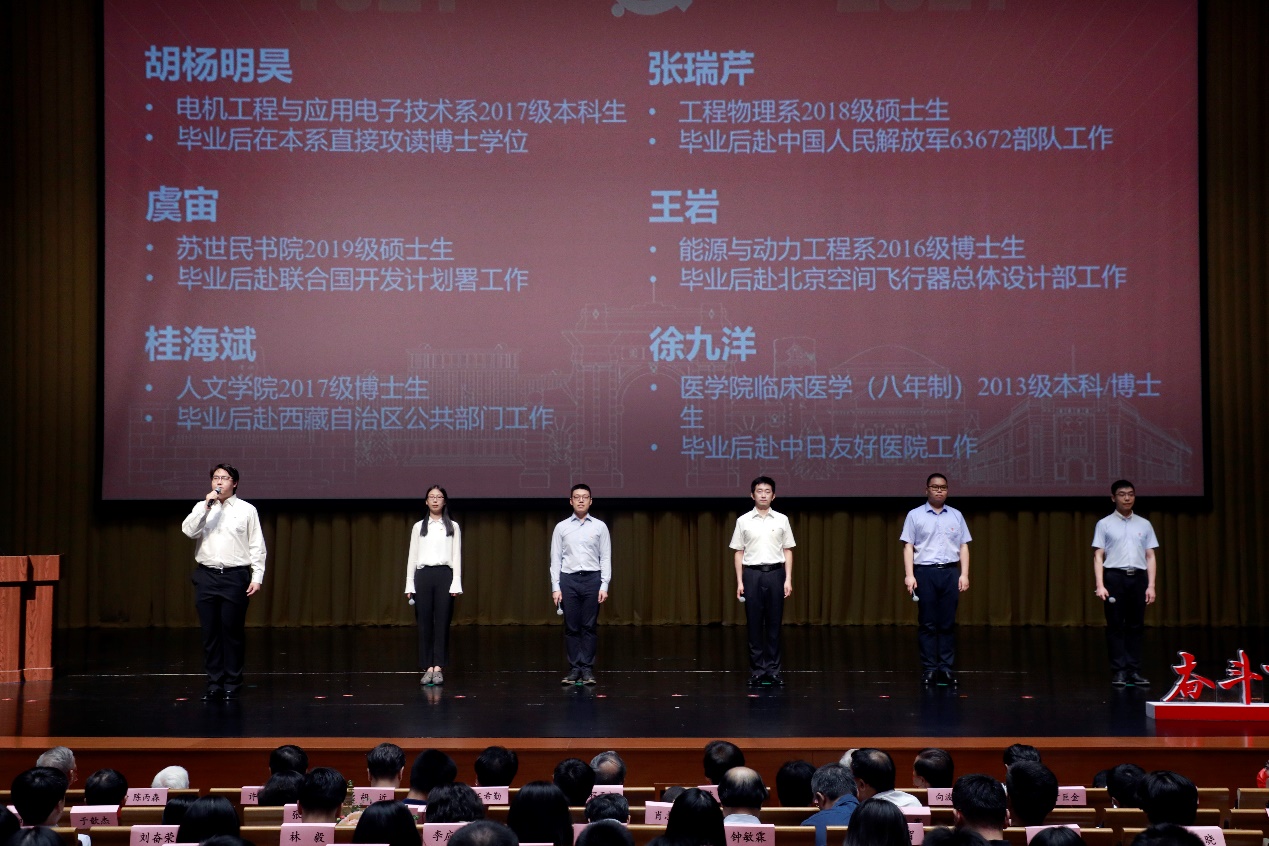 电机工程与应用电子技术系本科毕业生胡杨明昊、工程物理系硕士毕业生张瑞芹、苏世民书院硕士毕业生虞宙、能源与动力工程系博士毕业生王岩、人文学院博士毕业生桂海斌、医学院博士毕业生徐九洋作分享发言。胡杨明昊在本科期间积极参与党建工作,毕业后将攻读博士学位,并申请担任学生政治辅导员。张瑞芹通过自强计划入读清华,毕业后将进入部队工作。虞宙自学德语、法语等多门外语,毕业后将赴联合国开发计划署工作。王岩立志把中国建设成为航天强国,毕业后将前往北京空间飞行器总体设计部工作。桂海斌毕业后将赴西藏公共部门工作,希望把清华所学和基层实践经验运用到西藏建设中去。徐九洋为身边的老师奔赴抗疫前线所感动,毕业后将赴中日友好医院成为一名临床医师。毕业生党员代表的分享,折射出一代清华学子投身强国伟业的坚定信念和深刻思考,他们将在毕业之际奔赴四面八方,在关系国计民生的关键领域贡献智慧和力量。