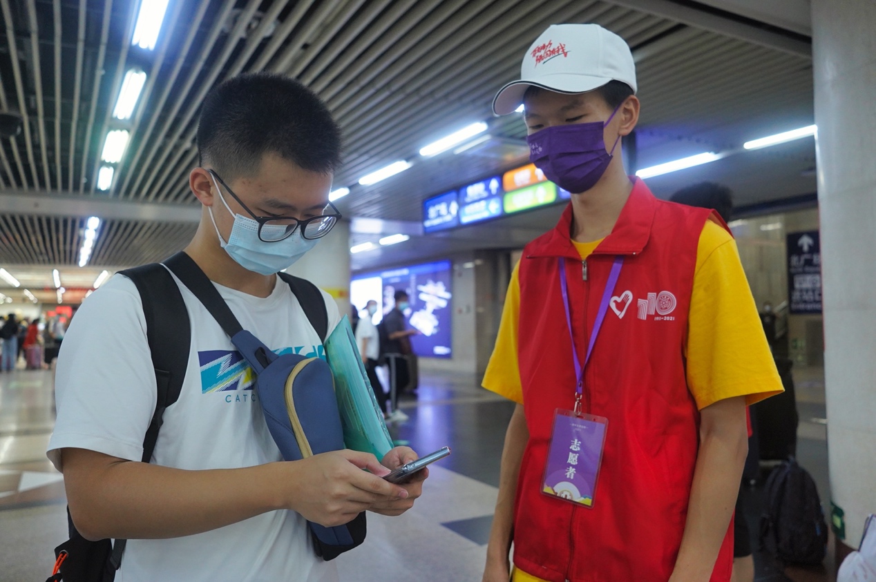 志愿者在车站为新生引路