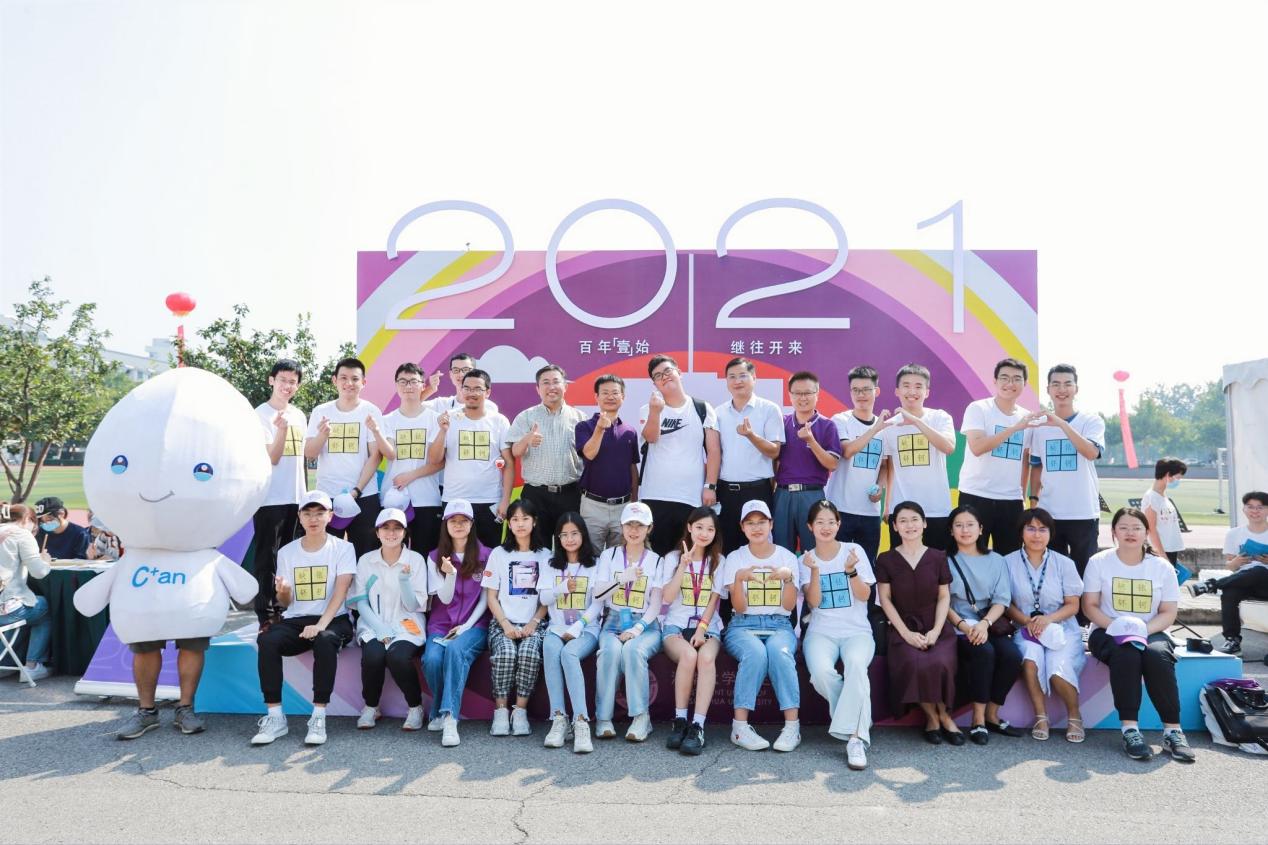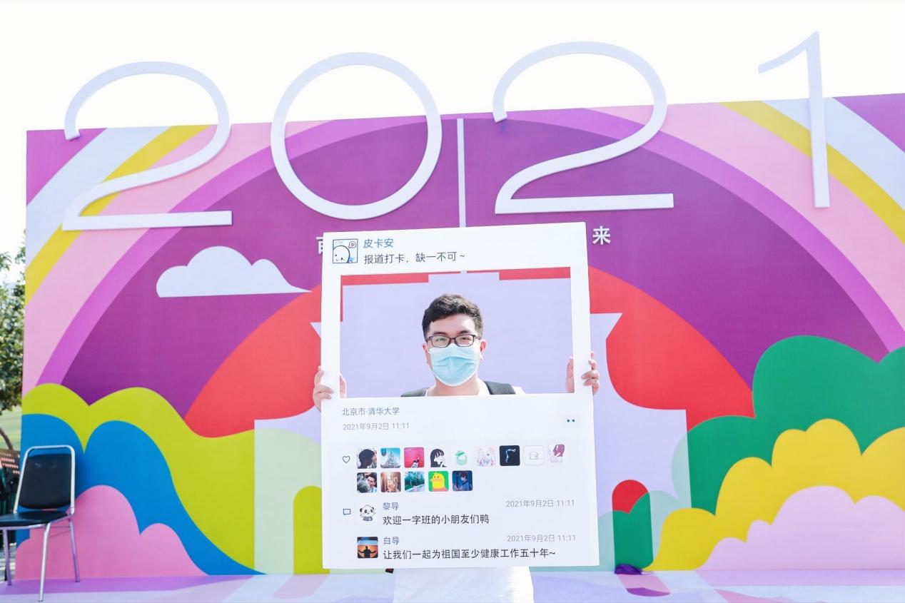 迎新现场,以“百年‘壹’始,继往开来”为主题的迎新活动丰富多彩:舞台上艺术团用精彩的表演欢迎新同学;合影台上,大家拿起“行胜于言”“自强不息,厚德载物”“2021清华我来啦”等手持合影板争相拍照,留下自己初入清华的宝贵瞬间;心愿墙上,新的“一字班”一笔一画写下心愿与志向,贴成“2021”的字样;现场准备的建党百年主题学习卡吸引不少同学驻足,大家拿起图文并茂的趣味卡片学习百年党史,感受清华红色传统。