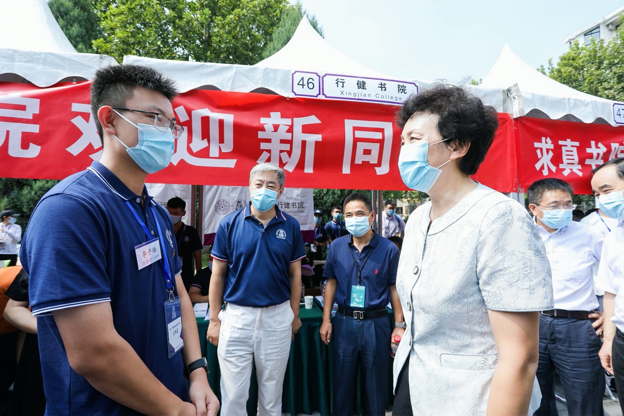 在“热烈欢迎新同学”的彩虹门内,各院系的迎新报到点布置醒目,一字排开。陈旭走上前去与迎新工作人员和正在办理手续的新生热情互动,详细了解迎新工作情况和新生报到情况。在行健书院迎新点,陈旭与新生骨干营的同学们亲切交流。其中,李子腾是一名来自江苏的新生。他说,选择行健书院是因为心中怀揣航天理想,希望将来能为国家航天事业的发展作出自己的贡献。陈旭欣慰地表示,同学们有这样远大的志向非常可贵,也相信清华能够成为大家实现梦想的摇篮,“欢迎你们来到清华园!”。