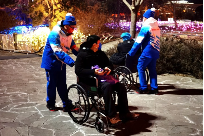 迅速响应,移动助行分队火速上岗。在冬残奥会期间,由19名同学组成移动助行小分队,承担起了专门为轻度残疾、腿脚不便、突发伤病等出行不便的观众提供轮椅接送服务的重要临时任务。轮椅助行员每人配备一副轮椅,需要第一时间主动识别、引导有需求的观众,将他们从残联落客区接送至看台区,力求提供最温暖、最贴心的服务。他们的足迹分布在场外的路上,基本看不见场内的精彩;但场内的精彩,离不开他们细致体贴的服务。