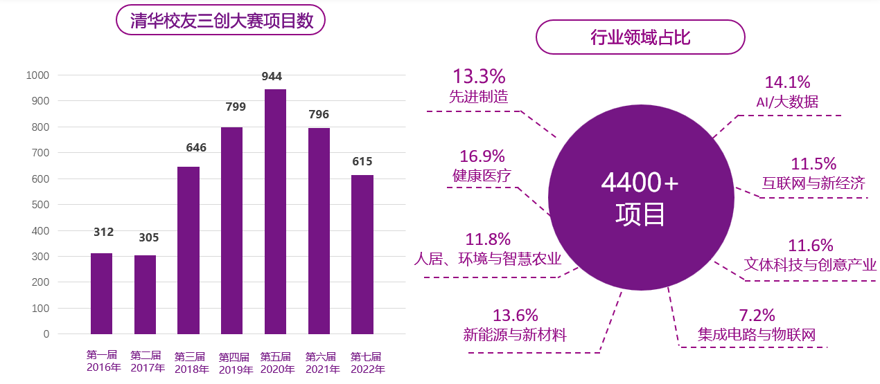 持续推进“清华校友创意创新创业大赛”,创新推出“清华校友创新论坛”,为经济社会发展贡献清华人的智慧与力量。“清华校友创意创新创业大赛”(简称“三创大赛”)是2016年清华校友总会发起的一项大型赛事活动,致力于搭建清华校友创业生态圈,助力校友创新创业。三创大赛受到社会各界的支持,已累计4000多个项目参赛,700多名企业家、投资人和专家担任创业导师,60多个城市举办过三创大赛活动。三创大赛被《全国双创示范基地百佳案例》收录。2021年第六届三创大赛创新赛事机制,分别与中国航天科工集团、长安汽车股份有限公司、桐乡市人民政府联合主办“揭榜挂帅”专题赛,为企业和地方切实有效地解决实际问题。