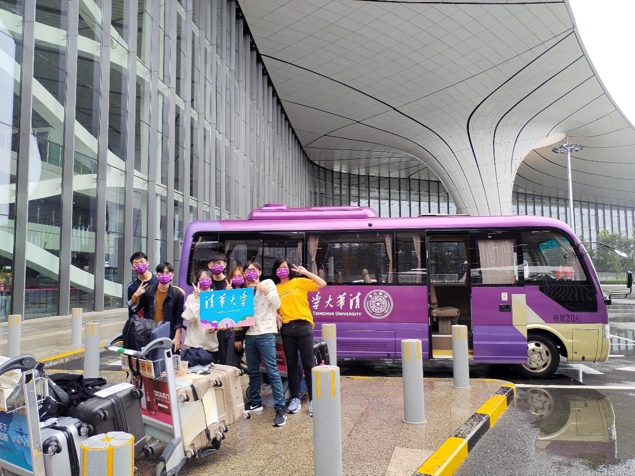 王伟接机后为学生拍摄合影
