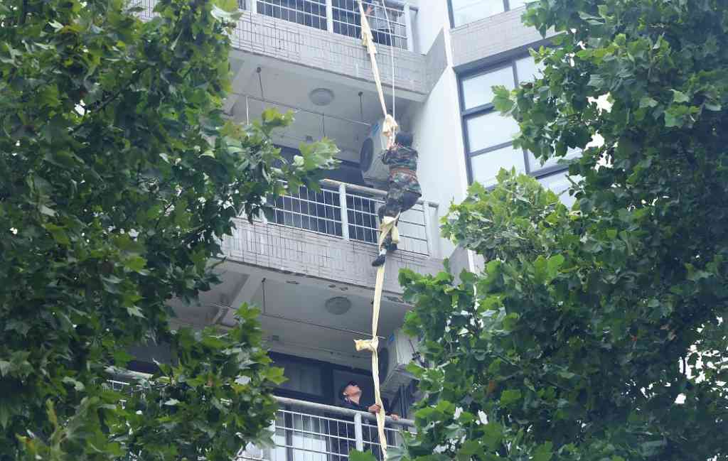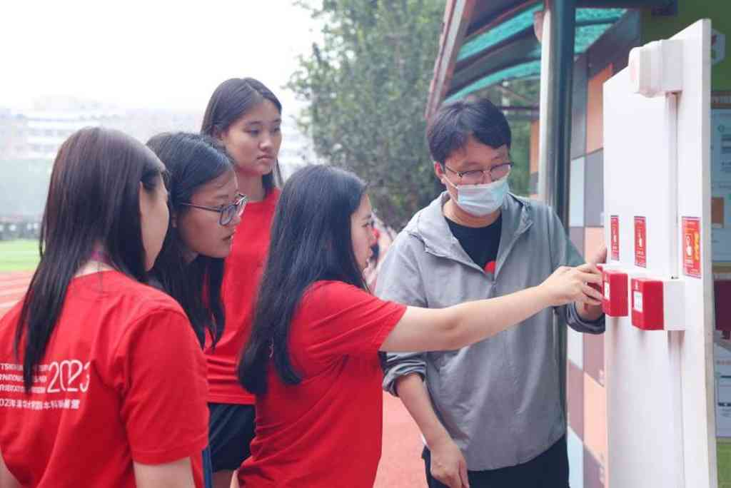 车辆与运载学院的牛木希、余崔文靖、刘怡雯等5名本科新生志愿者现场演练床单结绳、滑绳自救、医疗救护等自救项目,海淀消防救援支队开展高空云梯救人、高压水车“灭火”等科目演练。