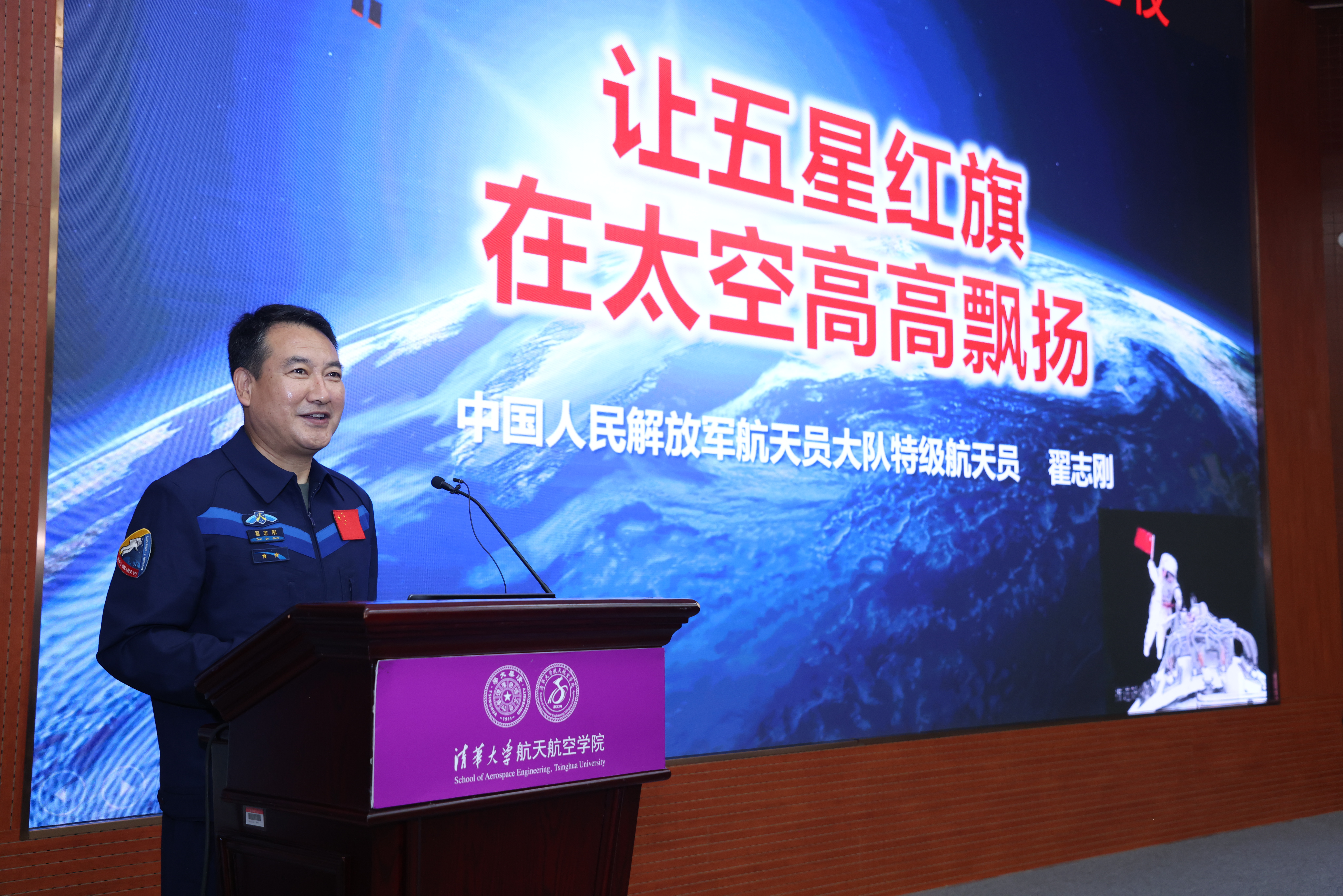 返校当天,他在航天航空学院的启航讲堂作了题为“让五星红旗在太空高高飘扬”的主题报告,并与在场的师生和校友进行了亲切交流。在报告中,他讲述了中国载人航天工程的“三步走”发展战略,结合自身成长经历,介绍了中国航天员严格的选拔和培养流程。他用自己在训练和多次执行航天任务中的见闻与影像资料,向清华师生展示了太空的美丽,在场观众无不为之震撼。在提问交流环节,航天航空学院在读学生、创新领军工程博士科学技术协会成员、清华“飞行员班”学员、已经在相关行业工作的校友纷纷举手提问。在热烈的交流气氛中,翟志刚感受到了各行各业师生、校友对于国家航天事业的关注与热爱。他说:“中国空间站的建设永远值得期待!”