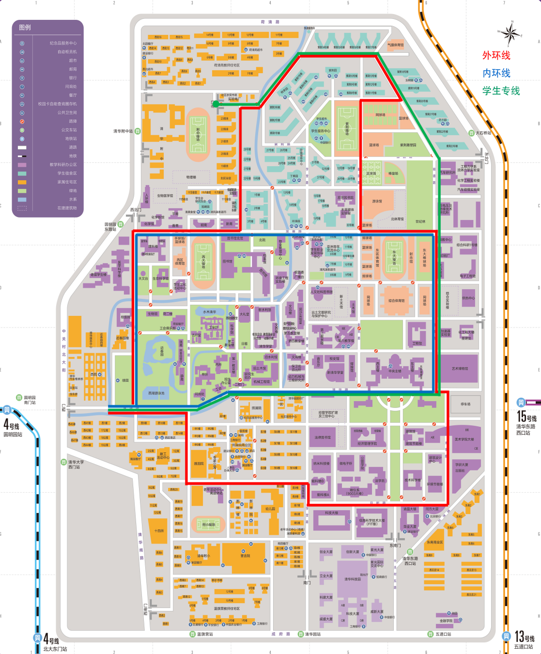 4)行车路线:桃李园—紫荆园—玉树园—东北门—世纪林—东侧门—艺术博物馆—西主楼—新清华学堂—二校门—后勤综合服务平台—西湖游泳池—西门—西湖游泳池—校医院—西北门—理科楼—西大操场—图书馆北馆—听涛园—游泳馆—世纪林